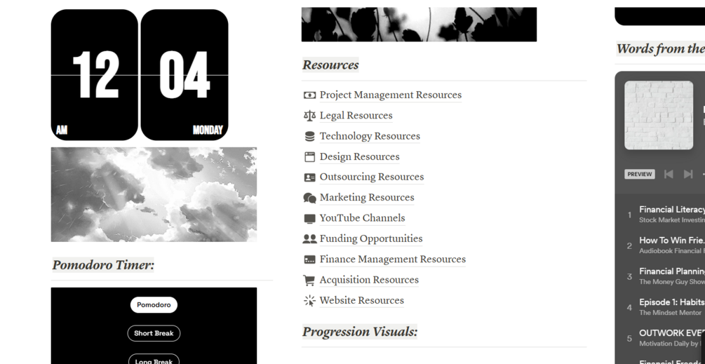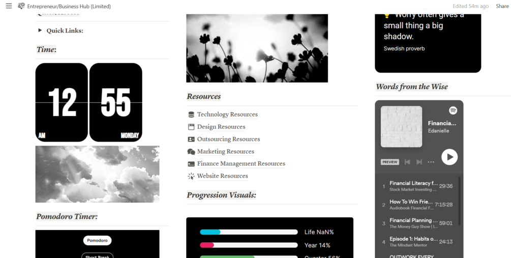 Welcome to the Entrepreneur Notion Page, a comprehensive resource hub designed to support and empower entrepreneurs on their journey to success. Whether you're just starting out or have been in business for years, this page is packed with resources to help you achieve your goals and take your business to the next level.
